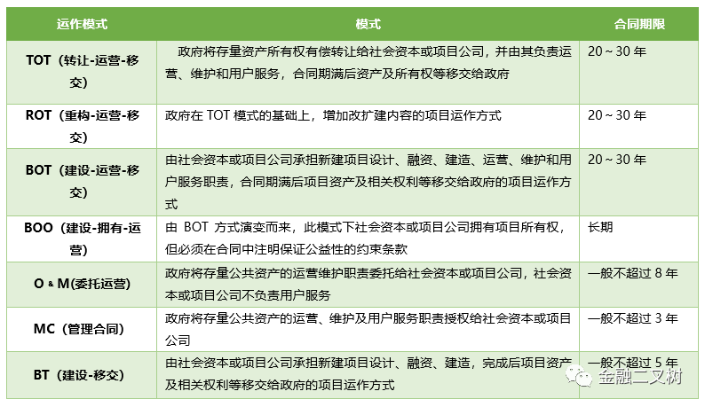 PPP項(xiàng)目主要有7種運(yùn)作模式,詳細(xì)情況如下表所示: