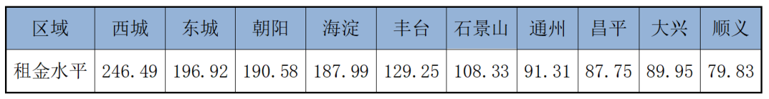 表1:3月北京各區(qū)寫字樓租金水平(單位:元/平方米/月)