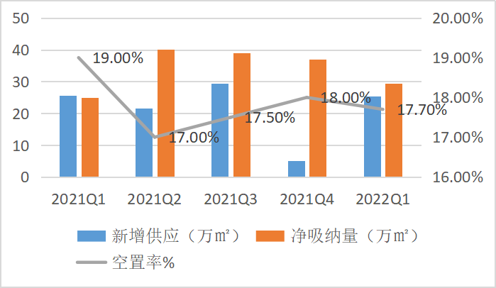 上海市一季度有四個新項目入市,分別是上海金融街二期、前灘信德文化中心、高尚領(lǐng)域T3和真如星光耀二期T1,總供應(yīng)量約為25.3萬平方米,凈吸納量為29.5萬平方米。截至3月末,上海市寫字樓空置率為17.7%,較上季度下降0.3%。