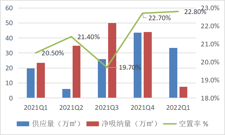 一季度深圳市投入使用的甲級寫字樓面積為33.5萬平米,全市季度凈吸納量環(huán)比下降82.8%,錄得7.6萬平方米。受需求滯后和疫情影響全市平均空置率在連續(xù)四個季度下降后再次環(huán)比微升0.1個百分點,至22.8%。