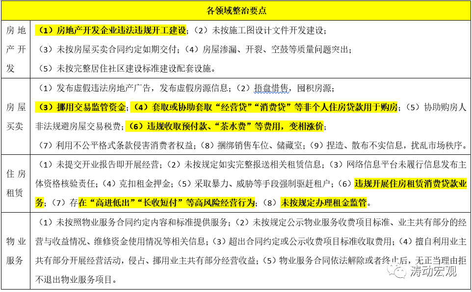 (二)因城施策突出整治重點,在上述四大領域抓整治要點,如嚴查地產開始企業違法違規開工建設、延期交付、房屋質量問題、捂盤惜售、挪用交易監管資金、違規收取預付款和茶水費等費用、違規開展住房租賃消費貸款業務、未按規定辦理租金監管和資金歸集等。