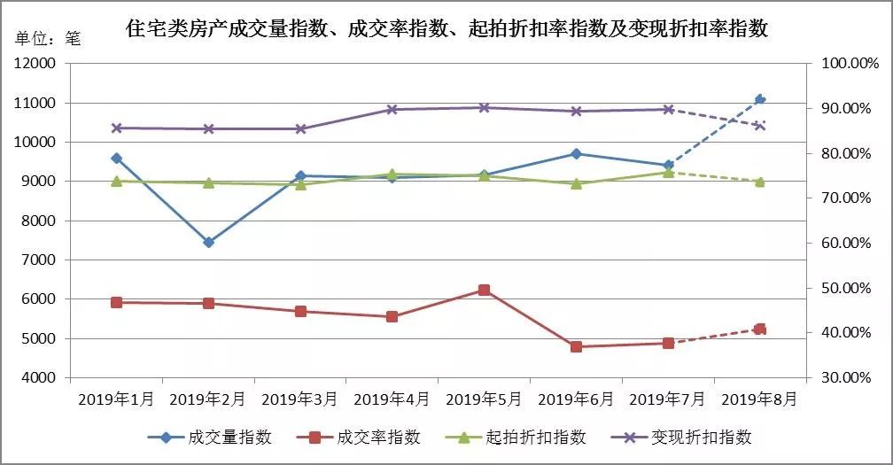 八月預測:成交量在279至321筆左右,成交率指數區間[29.19%,34.57%],起拍折扣指數區間[67.74%,69.13%],變現折扣指數區間[87.30%,91.18%]。