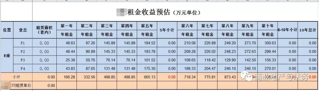 年度總收入=年租金收入(項目總投資×%,一般為8%-12%)+固定成本(如:人力、行政、財務、物管、資產折舊等)+變動成本(如:營運、招商、市場推廣費8%)+各種稅費 (如所得稅、房產稅、租賃稅等)+資產折舊(如:工程改造分攤費)+年度掉鋪率20%-30%,公式為:年租金收入×(1+20%)。 加3個月免租期,公式為:(年租金收入/12)×3。加前期開辦分攤費等+其它費用等
