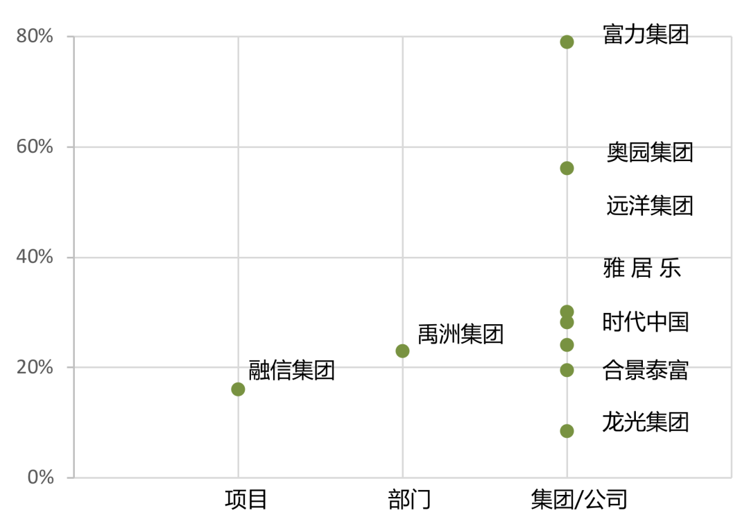 隨著公開拿地難度逐漸升級(jí),TOP11-50房企在愈發(fā)難以與頭部房企競爭的壓力下,相繼布局城市更新板塊,通過城市更新渠道維持土地儲(chǔ)備,其中粵系房企占比達(dá)20%,近9成的TOP11-50房企其城市更新占總土儲(chǔ)比例集中在15%-30%之間,其中富力占比頗高,達(dá)79%。