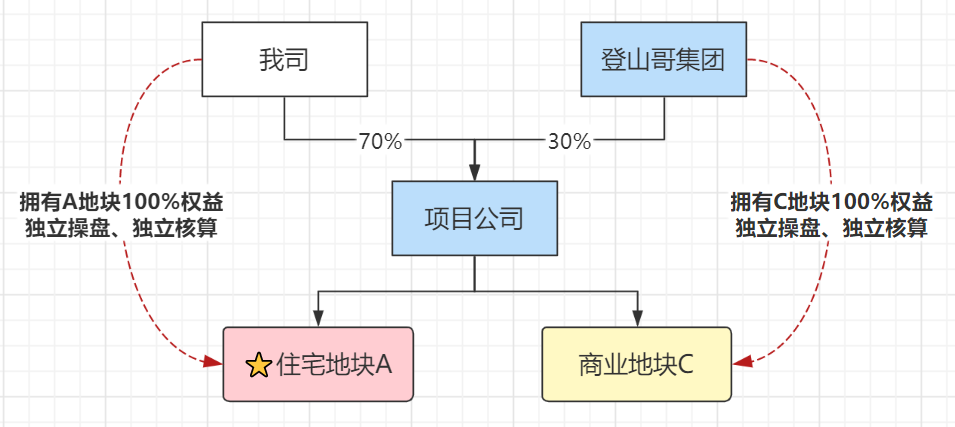 第二種是非同股同權,房企之間分地塊開發,各付盈虧,即——“分地塊、分帳套合作開發”。