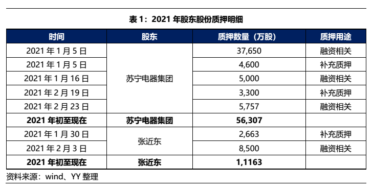 從時(shí)間線及主體來看,2021年以來電器集團(tuán)共質(zhì)押了近5.63億股,張近東共質(zhì)押了1.12億股,主要用于補(bǔ)充質(zhì)押和融資相關(guān)。截至2021年2月23日,蘇寧電器集團(tuán)持有公司19.88%的股份,共計(jì)質(zhì)押8.97億股,占所持股份的48.47%;截至2021年2月3日,張近東及一致行動人蘇寧控股集團(tuán)有限公司合計(jì)持有公司24.94%股份,共計(jì)質(zhì)押4.11億股,占所持股份的17.72%。