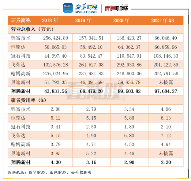 從研發費用投入上,翔騰新材的研發費用率呈下滑趨勢且逐漸低于可比公司研發費用率的中位水平。2018年至2021年三季度,公司的營收規模較低,而研發費用率又處于低位,公司在研發方面的投入或不足。