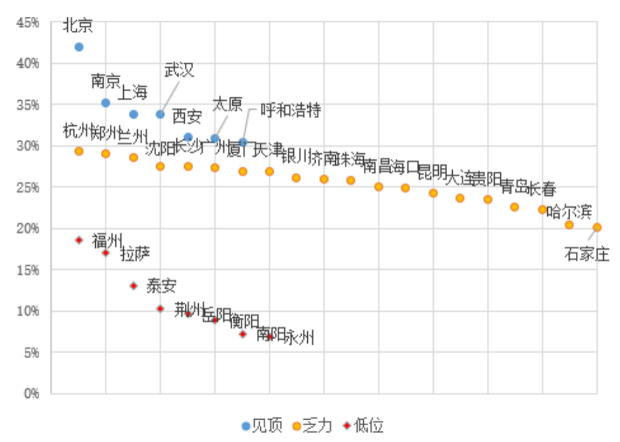 1、“高位見頂”型:大學生占比超過30%的城市,包括北京、南京、上海、武漢、西安、太原及呼和浩特等7個城市。這些城市基本均是高等教育資源比較豐富的城市,高學歷人才儲備資源豐富;近幾年來,在人才政策的利好下,這些城市的大學生占比進一步提升,目前已達到高位。而隨著人才政策紅利的消失,這些城市的大學生占比難再大幅提升,因此均屬于人才增長“見頂”型。