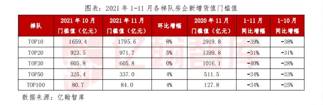 受其影響,為了續(xù)命、保命,房地產(chǎn)企業(yè)無疑會(huì)減少投資現(xiàn)金流出,拿地異常謹(jǐn)慎。進(jìn)入2021年下半年,頭部房地產(chǎn)企業(yè)防御性拿地、甚至不再拿地。2021年1-11月統(tǒng)計(jì)數(shù)據(jù)來看,頭部房企新增貨值平均降低了30%-40%。
