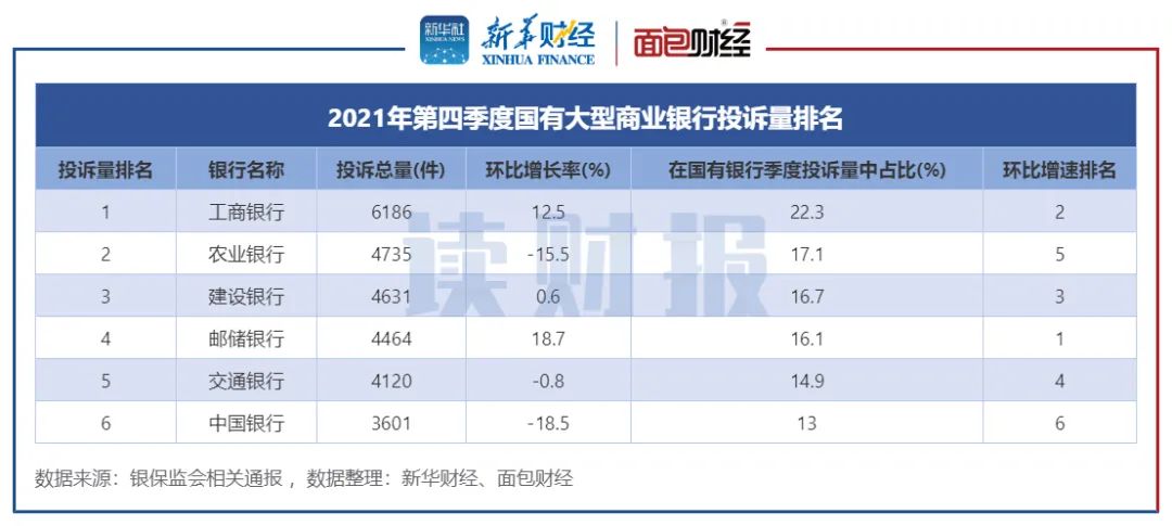 與第三季度相比,郵儲銀行投訴量環(huán)比增長18.7%,增速排名第一;工商銀行以12.5%的增速,排在第二位。