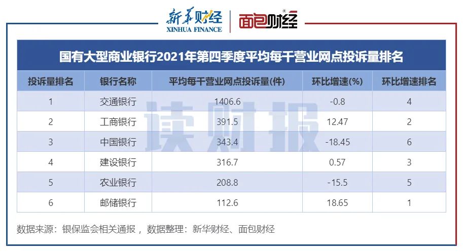 交通銀行2021年第四季度兩項指標(biāo)均位列國有銀行首位且明顯高于其他國有銀行,顯示出該銀行的相關(guān)業(yè)務(wù)服務(wù)質(zhì)量和消費(fèi)者權(quán)益保護(hù)水平亟待提升。