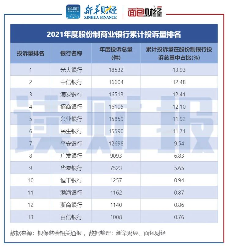股份銀行被投訴量排名:光大年度最高、興業(yè)季度最高、廣發(fā)密度最大