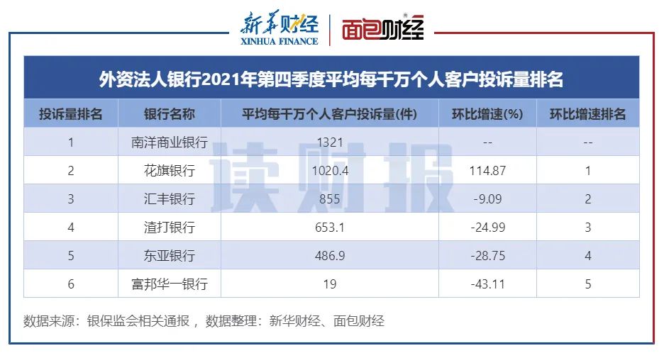 南洋商業(yè)銀行2021年第四季度平均每千萬客戶投訴量位居外資行首位,達(dá)到1321件。