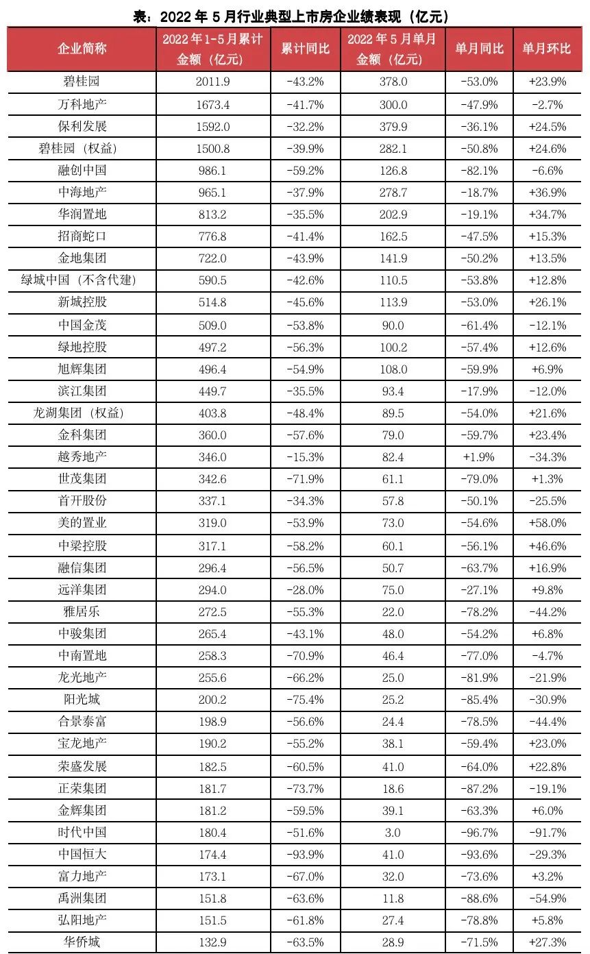 1、2022年5月,行業(yè)下行壓力持續(xù)、疊加部分城市疫情反復(fù),市場(chǎng)信心不足、企業(yè)表現(xiàn)仍相對(duì)低迷。TOP100房企單月實(shí)現(xiàn)銷售操盤(pán)金額4546.7億元,較上年同期降低59.4%。但得益于各地樓市紓困政策,加之“五一”假期房企推盤(pán)及營(yíng)銷積極性提升,環(huán)比增長(zhǎng)5.6%。累計(jì)業(yè)績(jī)來(lái)看,百?gòu)?qiáng)房企1-5月的整體操盤(pán)業(yè)績(jī)規(guī)模同比降低52.3%,降幅較上月進(jìn)一步擴(kuò)大。