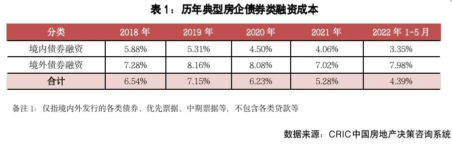 2、融資成本:2022年1-5月100家典型房企新增債券類1融資成本4.39%,較2021年全年下降0.89個(gè)百分點(diǎn),其中境外債券融資成本7.98%,較2021年全年上升0.96個(gè)百分點(diǎn),境內(nèi)債券融資成本3.35%,較2021年全年下降0.71個(gè)百分點(diǎn)。單月來(lái)看,5月房企融資成本4.81%,環(huán)比上升1.55pct,同比下降0.4pct。其中境內(nèi)融資成本3.73%,環(huán)比上升0.5pct,發(fā)債主體仍是集中在中海、保利發(fā)展、華潤(rùn)置地等國(guó)企央企,但是相較于4月而言發(fā)債企業(yè)的數(shù)量以及債券發(fā)行的規(guī)模均有所減少;境外融資成本10.38%,環(huán)比大幅提升了6.58pct,主要是因?yàn)樯蟼€(gè)月僅有遠(yuǎn)洋集團(tuán)發(fā)行了一筆成本較低的綠色債券,而本月由于中梁和大唐因?yàn)榻粨Q要約而發(fā)行了3筆優(yōu)先票據(jù),融資成本都相對(duì)較高。