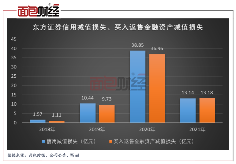 2018年以來(lái),東方證券或出于控制信用風(fēng)險(xiǎn)的考量,持續(xù)縮減了買(mǎi)入返售金融資產(chǎn)的規(guī)模,從而導(dǎo)致買(mǎi)入返售金融資產(chǎn)利息收入逐年下降。但由該資產(chǎn)產(chǎn)生的減值損失卻未見(jiàn)明顯跌勢(shì)。2020年和2021年,買(mǎi)入返售金融資產(chǎn)分別產(chǎn)生減值損失36.96億元和13.18億元,均高于2018年和2019年發(fā)生的金額。