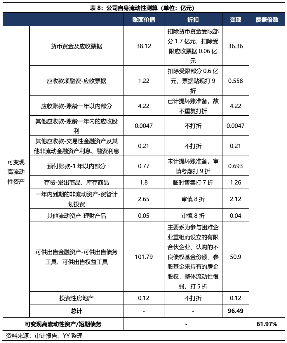 據(jù)測算結(jié)果,極限變現(xiàn)的情況下,公司自身流動性對短期債務(wù)的覆蓋程度僅有61.97%,尚存在59.21億元資金缺口有待備用流動性即再融資的補足。