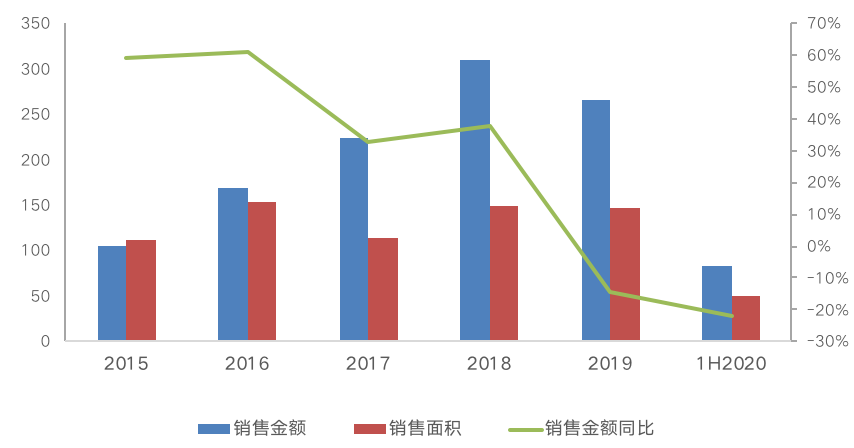 四大AMC地產平臺發展規模最大的為中國信達旗下的信達地產。作為中國信達旗下的唯一地產上市平臺,于2015年銷售金額首次實現進入全國房地產銷售百強,總土儲達到487.6萬平方米。2016年由于政策調控等原因,信達地產項目開發速度緩慢,2019年全年以及2020上半年權益銷售金額均呈現負增長。