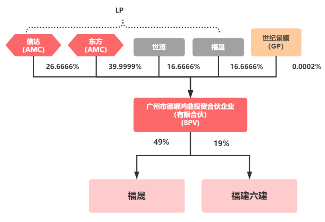 2020年世茂與福晟正式簽訂戰略合作協議,2020年1月,世茂和福晟聯合兩家AMC(東方與信達)共同出資設立德耀鴻鼎,德耀鴻鼎分別受讓福晟49%和福建六建19%的股權。
