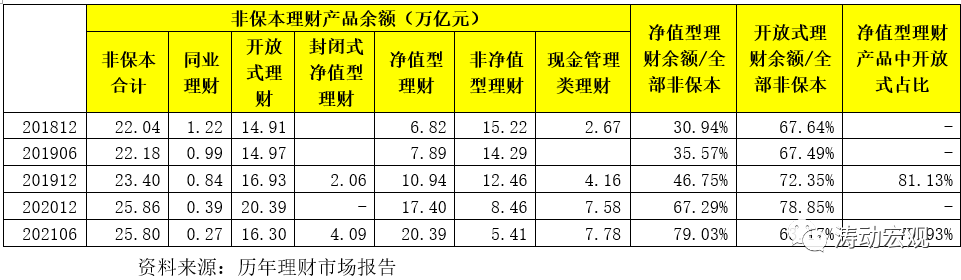 根據(jù)《中國(guó)銀行業(yè)理財(cái)市場(chǎng)報(bào)告(202106)》,截至2021年6月底,凈值型理財(cái)產(chǎn)品余額達(dá)到20.39萬(wàn)億,占全部非保本理財(cái)?shù)?9.03%,其中開(kāi)放式凈值型理財(cái)產(chǎn)品余額和封閉式凈值型理財(cái)產(chǎn)品余額分別為16.30萬(wàn)億和4.09萬(wàn)億。