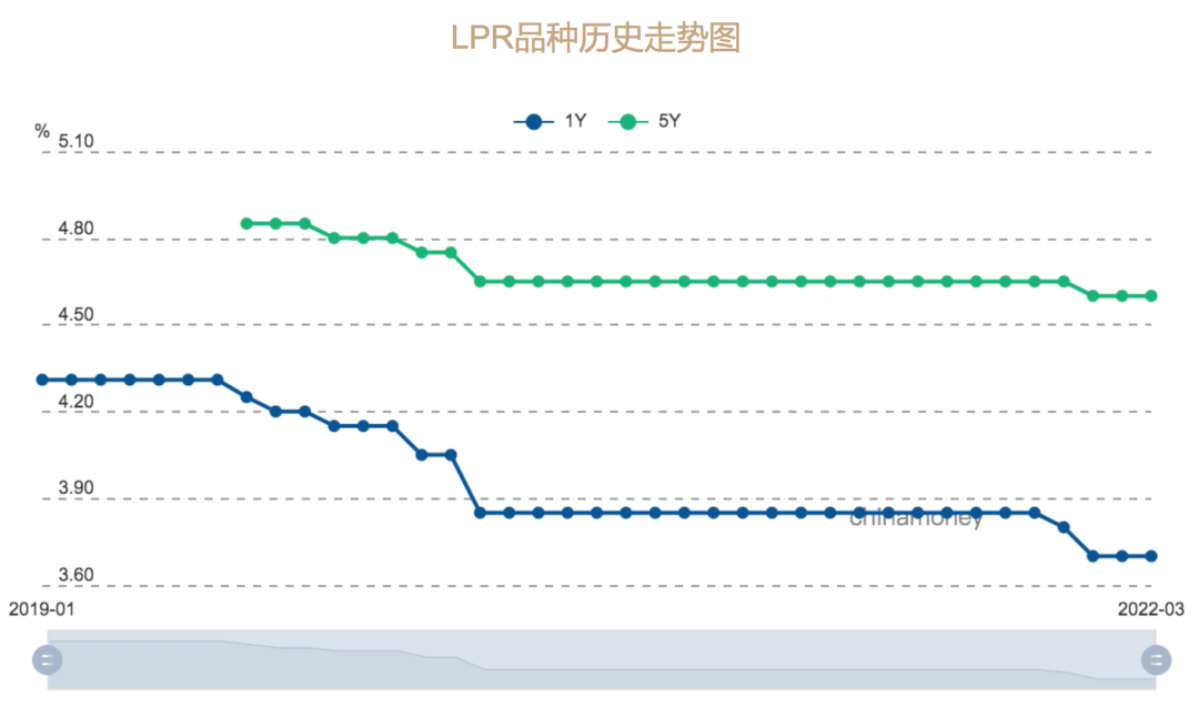 在此之后,2022年至今5年期LPR一直保持較低水平。2022年3月21日,最新公布的LPR數(shù)據(jù)顯示,2022年3月1年期LPR和5年期LPR與上個月持平,分別為3.7%和4.6%。