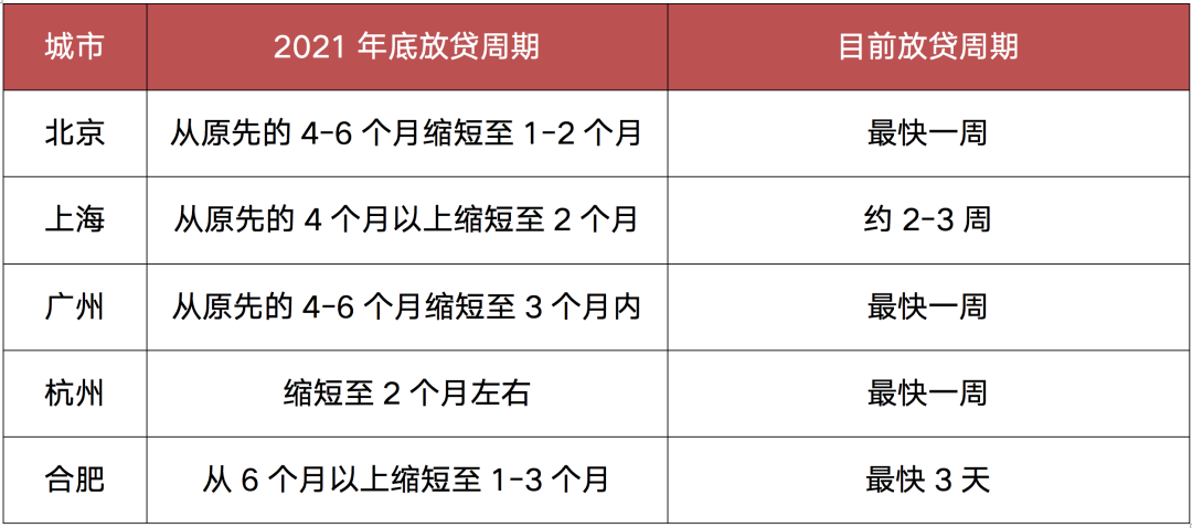 北京在2021年底放貸周期從4-6個月縮短至1-2個月的基礎上進一步加快,部分銀行一周內(nèi)即可放款。上海房貸發(fā)放審批周期也從2021年底4個月以上縮短至2個月的基礎上進一步加快,縮短至2-3周。廣州和杭州的個別銀行也和北京一樣最快一周就能放款。在我們的調(diào)研中,放款時間最短的是合肥,據(jù)某銀行工作人員表示:“目前我了解到的,肥東這邊有銀行最快可三天放款,當然具體的還是得看銀行的要求。”