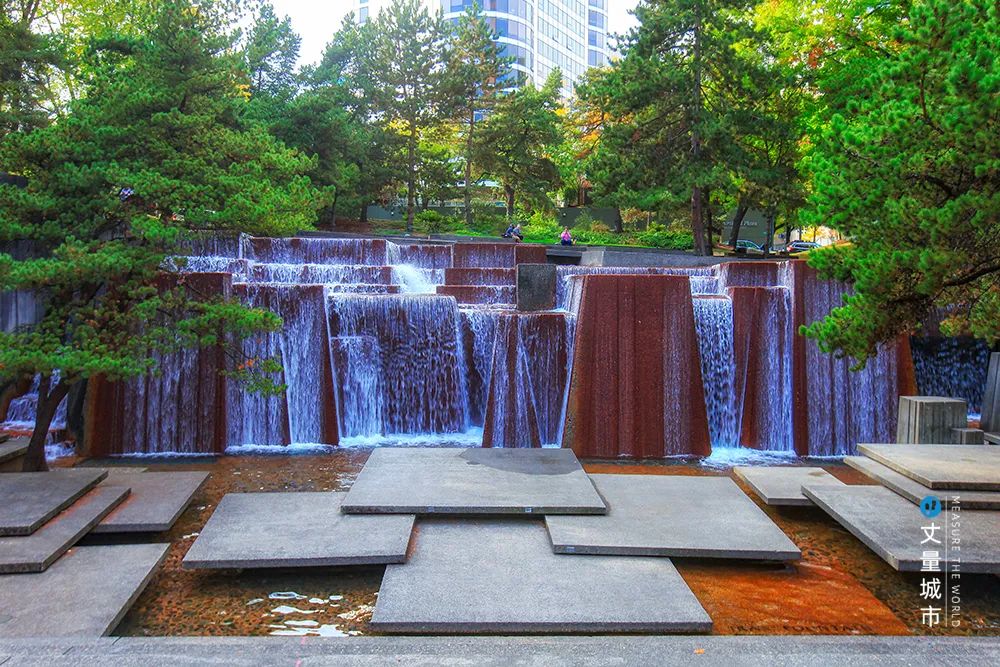 除了這種純粹空間的連接,美國景觀設計大師勞倫斯·哈普林的代表作波特蘭系列城市廣場綠地這一序列化敘事的景觀,更是將小尺度空間在更高的主題層面擰成了一個整體。
