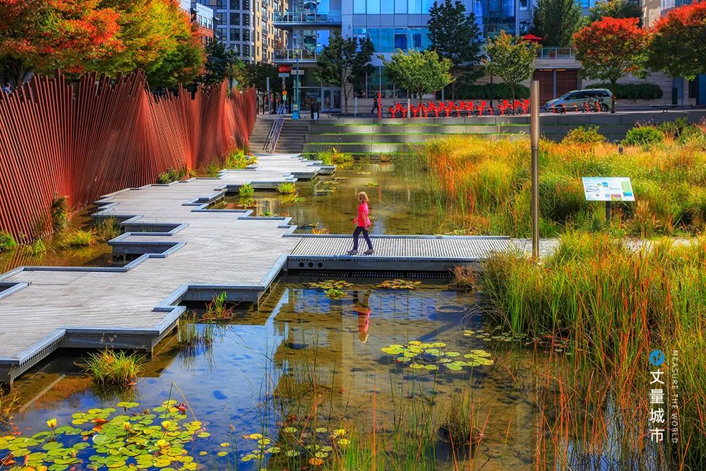 俄勒岡會議中心延伸地帶的雨園,就開創了海綿城市建設的先鋒,項目不僅巧妙地解決了雨水排放和過濾的問題,同時還創造了優美的景觀環境空間。