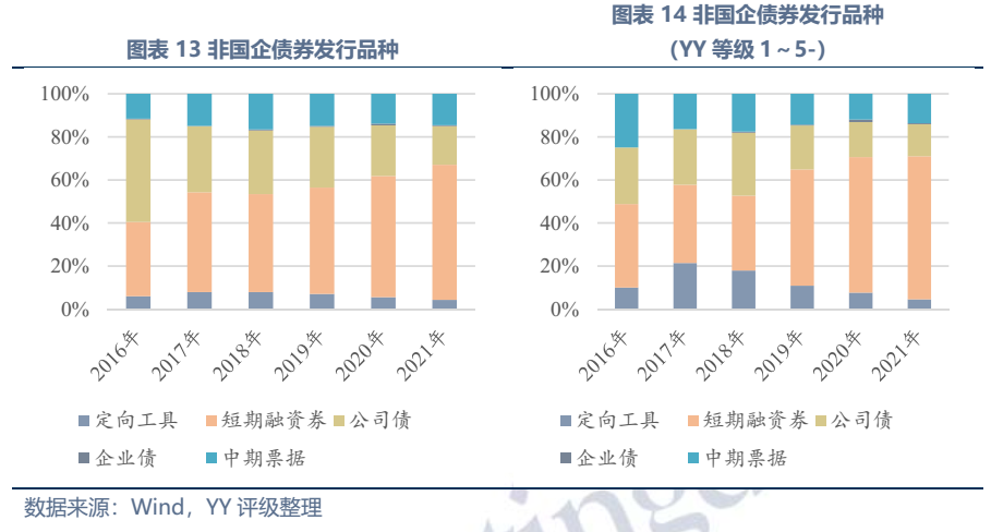 另外,從發(fā)行品種來看,無論是全部非國企還是投資級非國企,近年來發(fā)行短期融資券的比例都逐年提升,2021年短期融資券在全部非國企、投資級非國企新發(fā)債券中的比例分別高達62.7%、66.4%。尾部民企短期融資券發(fā)行占比提升主要是發(fā)行長期限品種較難,而對于信用資質(zhì)較好的民企,其發(fā)行長期限品種減少或反映民企債權(quán)融資用途愈來愈集中于籌集日常運營資金,而進行長回報期資產(chǎn)投資的意愿下降。