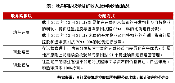 21個商業(yè)并入,遠洋集團商業(yè)版圖擴大。紅星地產(chǎn)還擁有21個知名的商業(yè)項目,根據(jù)收購框架協(xié)議,紅星地產(chǎn)持有的商場和商業(yè)街,原則上仍委托紅星控股指定服務提供商運營,也就是說將繼續(xù)委托愛琴海集團對21個商業(yè)項目進行運營管理。目前,商業(yè)項目已有3家處于開業(yè)狀態(tài),預計今明兩年新增開業(yè)數(shù)量十余個,項目超30%位于華東區(qū)域。截至2020年底,遠洋集團共持有18個經(jīng)營中的投資物業(yè),主要為寫字樓項目,多位于北京及環(huán)渤海區(qū)域,此次股權合作也是對遠洋商業(yè)版圖的擴充。遠洋集團物業(yè)服務方面也將進一步優(yōu)化。紅星地產(chǎn)的物業(yè)管理平臺也將按照賬面凈資產(chǎn)的價格轉(zhuǎn)讓,由遠洋集團和遠洋資本100%持有。未來3年內(nèi),隨著項目進入交付期,該紅星物業(yè)管理平臺在管面積有望突破2,000萬平方米。同時遠洋集團旗下遠洋服務截至2020年末物業(yè)合約面積約為7110萬平方米,此次合作后遠洋集團將通過管理資源整合、業(yè)主增值服務的提升及經(jīng)營結構的調(diào)整完善,不斷提升物業(yè)的資產(chǎn)和服務質(zhì)量。紅星控股推進輕資產(chǎn)戰(zhàn)略,降負債穩(wěn)現(xiàn)金流。從紅星方面來看,本次紅星控股和遠洋集團合作,與紅星地產(chǎn)的母公司紅星美凱龍控股的債務壓力不無關系。紅星控股旗下家居品牌紅星美凱龍負債規(guī)模逐年攀升,紅星地產(chǎn)的主體紅星企發(fā)也需要母公司資金輸血。根據(jù)紅星美凱龍控股2021年度債券報告來看,企業(yè)盈利規(guī)模下降而債務壓力增加,企業(yè)2020年凈利潤29.8億元,同比下降45.1%。而企業(yè)2020年凈負債率達99.8%。長短債務比1.62,較上年下降0.36,短債比重增加;且現(xiàn)金短債比0.56,較上年下降0.07,現(xiàn)金已經(jīng)無法覆蓋短債。紅星控股欲剝離地產(chǎn)資產(chǎn)獲取穩(wěn)定現(xiàn)金流,發(fā)展家居主業(yè)。截至2020年年末紅星控股的地產(chǎn)主業(yè)占比37.89%,地產(chǎn)板塊融資難或為此次交易的原因之一。對于家居起家的紅星控股來說,其可能希望通過對地產(chǎn)板塊部分資產(chǎn)的剝離,將資源集中在原來的家居主業(yè)板塊,這對“+地產(chǎn)”的企業(yè)來說,是一次聚焦主業(yè)的回歸。本次交易完成后,將降低紅星控股有息負債水平,資產(chǎn)負債率也將會優(yōu)化,同時紅星控股仍持有紅星地產(chǎn)的利潤分配權,未來將帶來持續(xù)穩(wěn)定的現(xiàn)金流。這次的遠洋收購紅星,只是上半年地產(chǎn)收并購的一個縮影。在上半年的收并購案例中,有傳統(tǒng)的“大魚吃小魚”,金茂收購中國宏泰,只用了22億元,撬動8個城市運營項目。“大魚吃大魚”也時有出現(xiàn),如融創(chuàng)收購彰泰集團,雙方成立合資公司,接手彰泰集團所屬目標公司100%權益,交易對價約99.1億元;市場上更有頭部房企收并購傳聞出現(xiàn)。另外近年來也有外資頻頻加碼中國房企,如黑石收購SOHO中國。