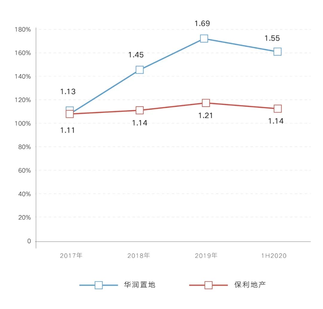 過去,頭部房企在規?;瘮U張過程中,傾向于借助預收賬款撬動企業經營杠桿,以達到滿足經濟資金需求和優化財務指標的目的,以華潤、保利為例,近年來預售賬款債務比持續提升,一定程度上達到了財務杠桿穩健的目標。