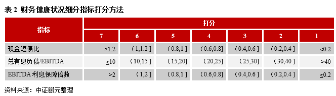 (3)“財務健康狀況”用于反映城投公司因不合理的財務杠桿所引起的財務風險程度,主要通過現金短債比、總有息負債/EBITDA、EBITDA利息保障倍數來考察。其中,“現金短債比”反映城投公司現金類資產對短期有息債務的覆蓋倍數,計算公式為:(貨幣資金+應收票據+交易性金融資產)/短期有息債務;“總有息債務/EBITDA”和“EBITDA利息保障倍數”反映城投公司EBITDA 對債務本息的保障程度。對城投違約的影響方向上,現金短債比、EBITDA利息保障倍數的數值越大,城投違約概率越小;總有息負債/EBITDA的數值越大,城投違約概率越大。