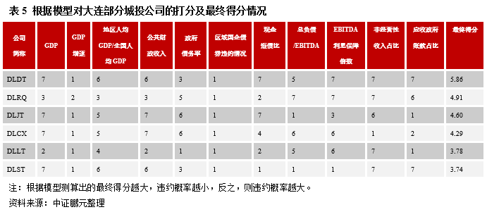 本小節將以“城投四大天王”之一的大連為例,將數據可得性較好的、尚有存續債券的6家城投公司作為樣本,運用模型推導出相應的結論,具體測算結果見下表。
