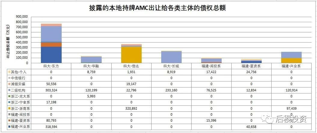 單從債權總額上看,東方的受讓規模遙遙領先,信達則因為不披露金額造成數據缺失。本地地方AMC的受讓總規模中,有一大部分都是來自本地其他AMC(主要是東方)。