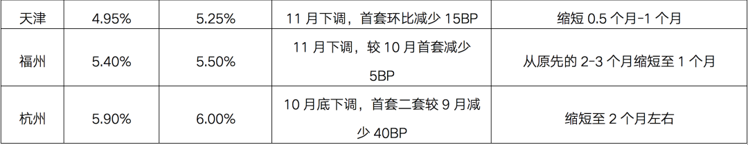 從房貸利率變化上看,在重點監(jiān)測的23個熱點城市中,有約5成城市當前的房貸利率較前期有明顯回落。如杭州、福州、天津、溫州、武漢、成都、重慶、鄭州、蘇州、南通和南昌等地首套房貸利率都較8-9月的高點有不同程度的回調,其中杭州于10月底下調,首套二套較9月減少40BP,成都與11月持平,首套較8月減少49BP,鄭州與11月持平,較9月高點下滑59BP和88BP。