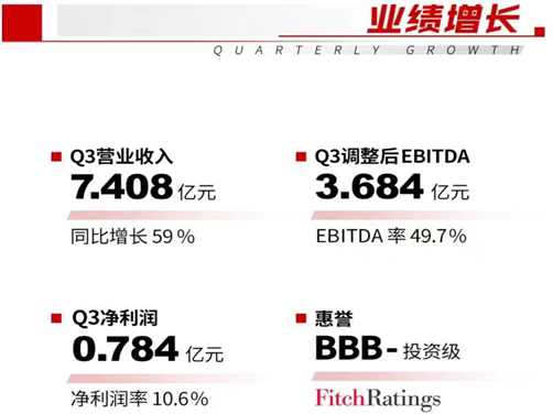 報(bào)告顯示,三季度公司實(shí)現(xiàn)主營業(yè)務(wù)收入7.41億元人民幣,同比增長59%;實(shí)現(xiàn)調(diào)整后的凈利潤達(dá)7800萬元,利潤率達(dá)10.6%;調(diào)整后的EBITDA(稅息折舊及攤銷前利潤)達(dá)3.68億元,同比增長61.57%。