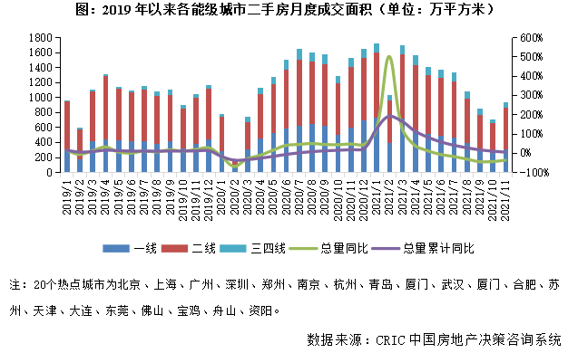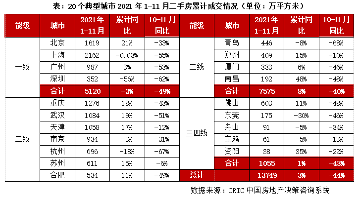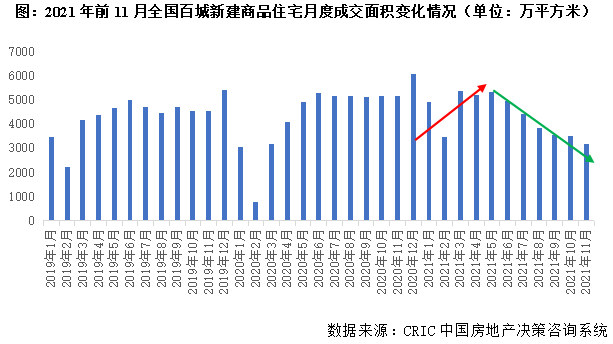 CRIC數(shù)據(jù)統(tǒng)計(jì)顯示,全國(guó)100個(gè)典型城市2021年前11月商品住宅成交面積合計(jì)47529萬(wàn)平方米,同比增1%。