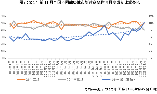 分能級(jí)來(lái)看,不同能級(jí)城市行情相對(duì)獨(dú)立,城市間分化也愈演愈烈:一線城市韌性較強(qiáng),收入渠道的多樣使得居民購(gòu)買力相對(duì)充裕,成交占比波動(dòng)上行;二線城市則呈現(xiàn)出平穩(wěn)態(tài)勢(shì),占比基本在50%左右波動(dòng),城市內(nèi)部分化加劇,漲多跌少,以廈門、杭州、南京、福州為典型的東南沿海城市,漲幅均在30%及以上;而諸如鄭州、昆明、南寧、西寧等中西部?jī)?nèi)陸城市,下行顯著;而廣大三四線城市回調(diào)加劇,跌多漲少,尤其是步入2021年下半年以來(lái),市場(chǎng)一再探底,11月當(dāng)月成交占比僅為40%,部分河南、山西、山東等中部三四線已然出現(xiàn)了首付分期、降價(jià)折扣等營(yíng)銷手段齊上依舊難以拉動(dòng)成交的情況,居民購(gòu)買力透支已是不爭(zhēng)的事實(shí),未來(lái)市場(chǎng)的成交表現(xiàn)難言樂(lè)觀。
