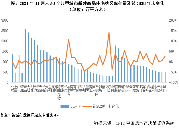 2020年整體的庫(kù)存變化延續(xù)了波動(dòng)上行趨勢(shì),1月跳增后,2-8月持穩(wěn),四季度以來(lái)伴隨供求轉(zhuǎn)淡,庫(kù)存量穩(wěn)步上升,截至到11月末CRIC監(jiān)測(cè)的100個(gè)重點(diǎn)城市庫(kù)存量達(dá)到了6.1億平方米,較2020年末上升了2%,不同城市漲跌參半,百城中有18個(gè)庫(kù)存消化周期高于24個(gè)月,大部分為缺乏基本面支撐的三四線城市,庫(kù)存風(fēng)險(xiǎn)浮出水面。