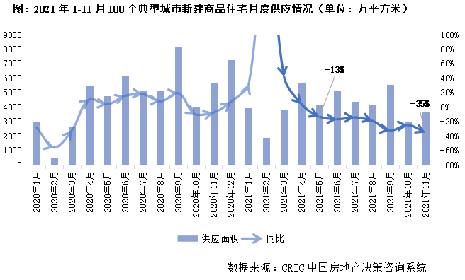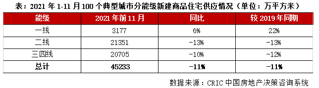 據(jù)CRIC統(tǒng)計(jì),2021年前11月全國(guó)100個(gè)重點(diǎn)城市商品住宅新增供應(yīng)面積45233萬(wàn)平方米,相較2020年和2019年均同比下降11%。受新開工萎靡影響全年新房供應(yīng)規(guī)模縮減至近三年低點(diǎn)。