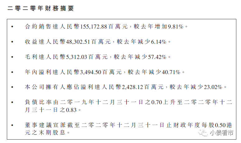 2020年,融信中國實(shí)現(xiàn)營業(yè)收入483.03億元,同比下滑6.14%;實(shí)現(xiàn)歸母凈利潤24.28億元,同比下滑23.02%;負(fù)債比率由2019年末的70%上升至83%。