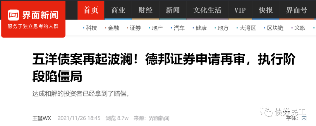 根據界面新聞于2021年11月26日的報道,德邦證券針對已經二審判決的五洋債提請再審。
