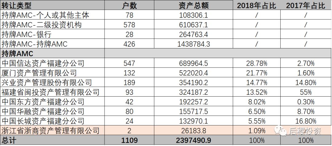 3:2017年~2018年浙商資管不斷加快了省外業務的布局,在福建不良資產市場的收購端和處置端都有不俗的業績,特此列入表中以供參考(實際數據遠比此表中所示的多,由于信息收集無法全面,僅作投資參考)