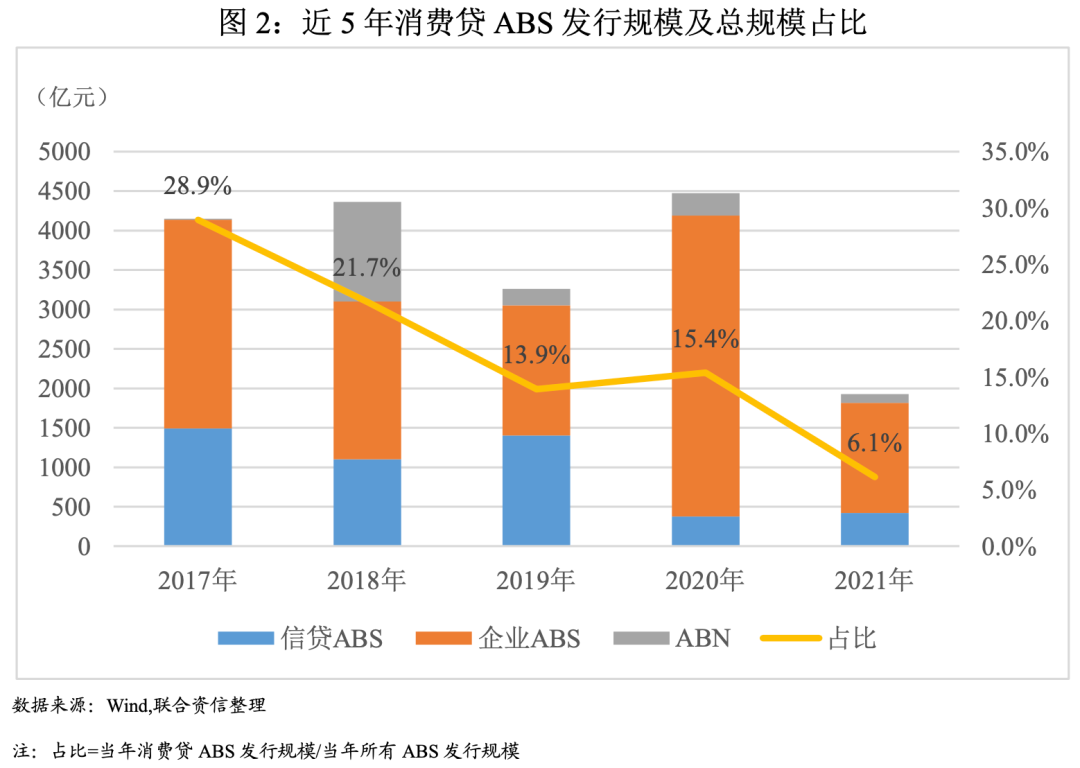 2、近5年消費(fèi)貸ABS發(fā)行呈波動下降趨勢