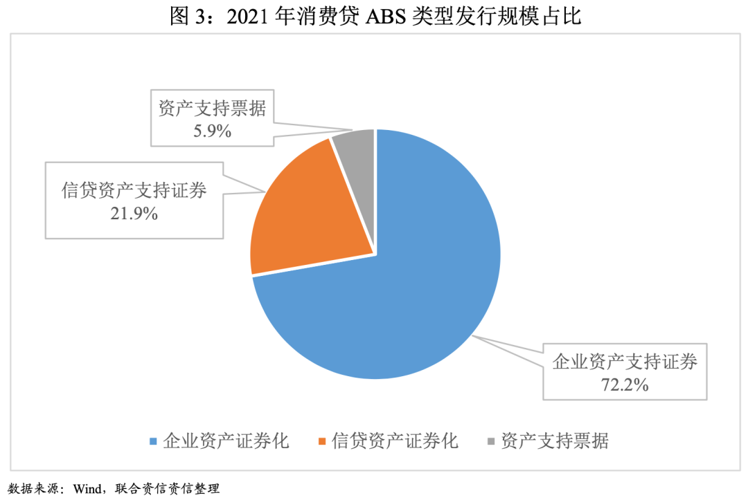 從細(xì)分市場看,2021年,消費(fèi)貸ABS市場共發(fā)行148單企業(yè)ABS,15單信貸ABS和8單ABN,發(fā)行量分別為1392.20億元、421.72億元及113.40億元,企業(yè)ABS在發(fā)行單數(shù)及規(guī)模上一直處于絕對優(yōu)勢,2021年單數(shù)占據(jù)86.5%份額,規(guī)模占據(jù)72.2%份額。縱向來看,受小貸公司注冊資本、杠桿率趨嚴(yán)等要求,小貸公司證券化融資需求增加,2020年消費(fèi)貸企業(yè)ABS發(fā)行量大幅提升,但2021年受監(jiān)管對發(fā)行政策收緊的影響,消費(fèi)貸企業(yè)ABS發(fā)行量下降明顯,接近2019年水平;消費(fèi)貸信貸ABS及消費(fèi)貸ABN發(fā)行量近幾年占比均較低,且呈現(xiàn)波動下降的趨勢,2021年消費(fèi)貸信貸ABS發(fā)行規(guī)模占比為21.9%,消費(fèi)貸ABN發(fā)行規(guī)模占比僅5.9%。