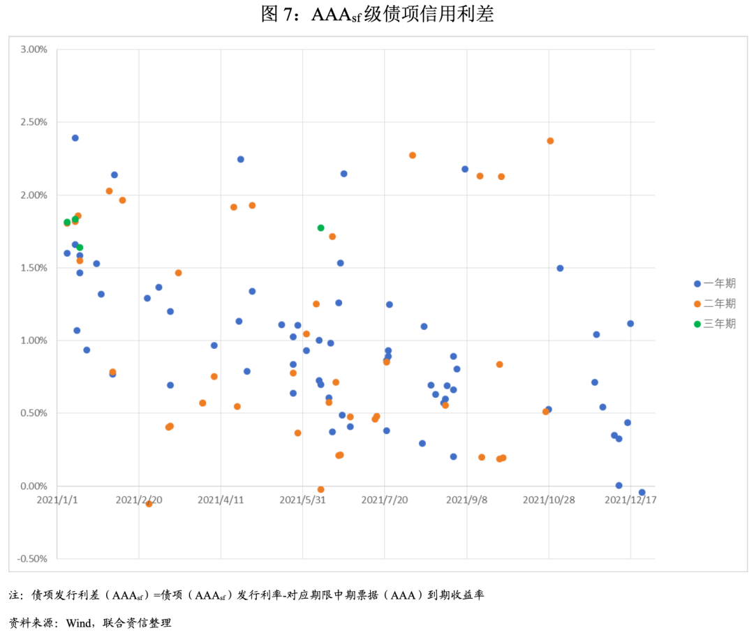 2021年,消費(fèi)貸ABS債項(xiàng)普遍高于對應(yīng)期限中期票據(jù)債項(xiàng)利率,AAAsf級別下,1年期債項(xiàng)利差均值為98bp,2年期債項(xiàng)利差均值為99bp,3年期利差均值為177bp。