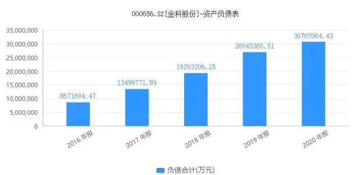 與許多靠負債實現規模發展的房企類似,金科股份銷售額從破千億,再到超2千億,這一路狂奔為也是通過杠桿經營發展起來的。2016年,金科股份負債合計867.2億元;到了2020年末,公司負債飆升至3076.59億元。