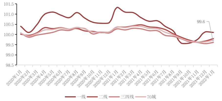 2021年四季度以來(lái)信貸等政策邊際放松的正向效應(yīng)正在釋放,此外房企在年末以價(jià)換量的沖刺之后,樓盤折扣回收也是價(jià)格指數(shù)回升的重要原因。相對(duì)而言,二手房在新房促銷的沖擊下處于弱勢(shì),信號(hào)傳遞有滯后性,1月環(huán)比整體及二三線城市均下跌。