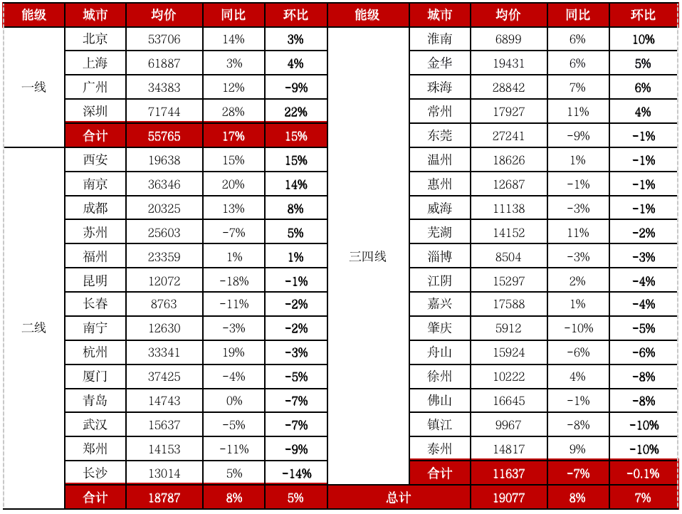 具體來(lái)看,一線城市中北京、上海、廣州和深圳分別環(huán)比上漲1.0%、0.6%、0.5%和0.5%;二線城市中16城環(huán)比上漲,重慶漲幅最大達(dá)0.9%,寧波、武漢、濟(jì)南、南寧、貴陽(yáng)、昆明等多城為半年內(nèi)首度環(huán)比回正。