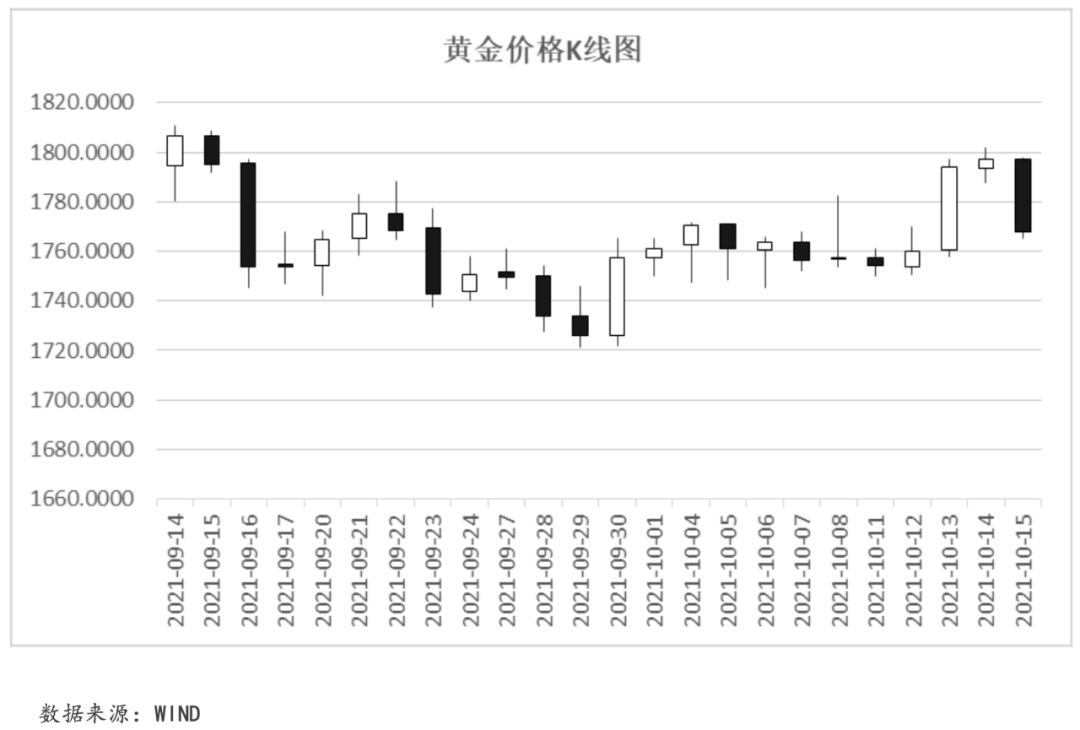 本周,上半周受美債收益率下行推動黃金價格上漲,周五公布的9月美國零售數據推升美債收益率,黃金價格承壓下降,但未能扭轉此前的漲勢。截至本周五,COMEX黃金價格收于1,768.10美元/盎司,周內累計收漲0.61%,扭轉了連續四周的下跌趨勢。